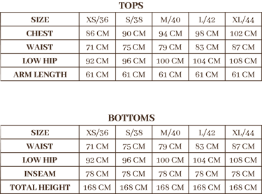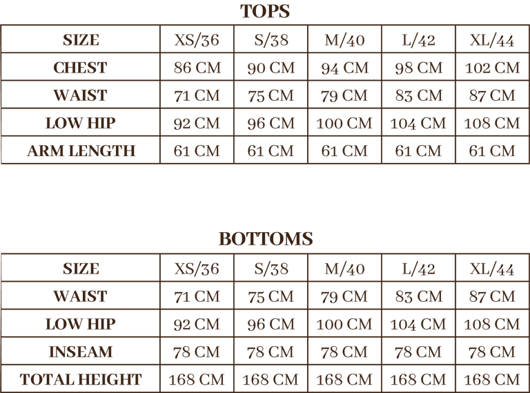 These size charts are a guide to help you find the right size for you. As many pieces are designed in a unique way, we suggest you also refer to the specific garment fitting description.